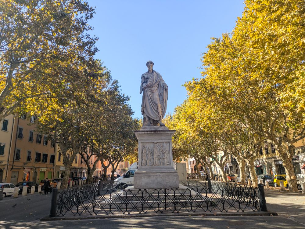 Proseguendo, ci imbattiamo nella nuova opera di street art : si chiama “Burn your Shadow Away“. L’artista inglese che l’ha realizzata si chiama D*Face. Si è ispirato a Frankestein, il celebre scritto di Mary Shelley che ha vissuto a Livorno qualche periodo della sua vita. Giriamo l’angolo e ci addentriamo nello slargo che in tanti conoscono per il Mercatino Americano, ormai da qualche anno in Via della Cinta Esterna, molto vicino al porto. Ci troviamo in Piazza XX Settembre, dove ci accolgono foglie ocra smosse dal vento. A dominare lo spazio, la statua di Leopoldo II di Lorena Granduca di Toscana, il quale attuò varie riforme e cambiamenti che beneficiarono Livorno. Davanti a lui la chiesa di San Benedetto che custodisce ancora l’organo con cui da giovane si esercitava Pietro Mascagni.